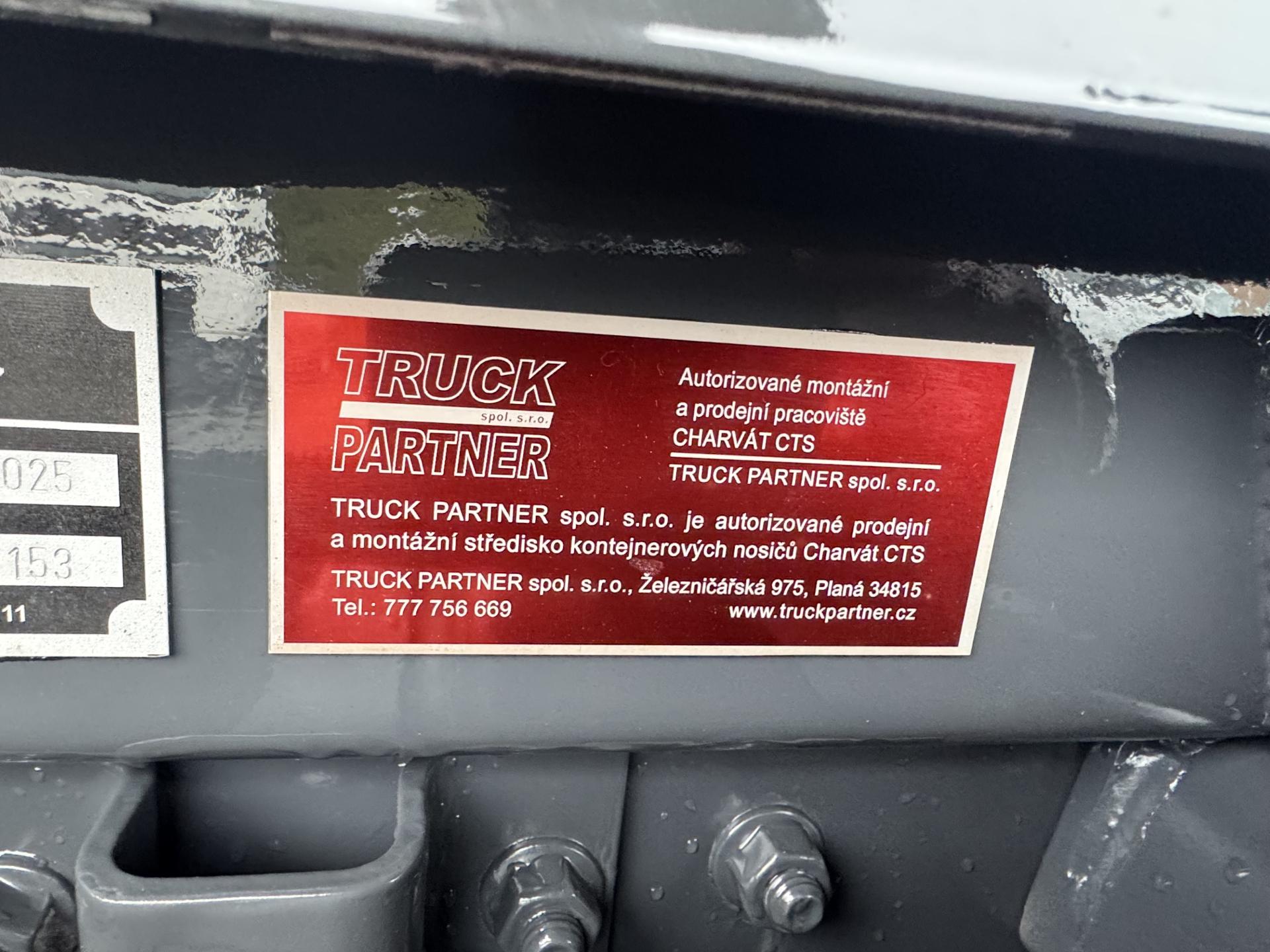 CENA 1 599 000,- KČ +DPH. Vozidlo s nájezdem 11 500km !!! ( bylo jako záložní vozidlo= doloženo protokoly z STK) s novým nosičem kontejnerů CHARVÁT CTS 10-39S, teleskopický, s výškou háku 1000mm, plná záruka od doby prodeje. TRUCK PARTNER s.r.o. je autorizovaný dealer, montážní středisko kontejnerů CHARVÁT CTS. Pneu 90%, kola 22,5, zadní ocelové pérování, motor 220 PS = 6tiválcový=EURO 6. Převodovka manuální =6tirychlostní. Vzduchové sedadlo řidiče, originál rádio, uzávěrka diferenciálu, el. výbava, majáky, přední nosný rám příslušenství bude zapsán v TP, popřípadě za příplatek možnost demontování + nový nárazník. Možnost kontejnerových van skladem. Možný leasing, úvěr od 10% akontace.